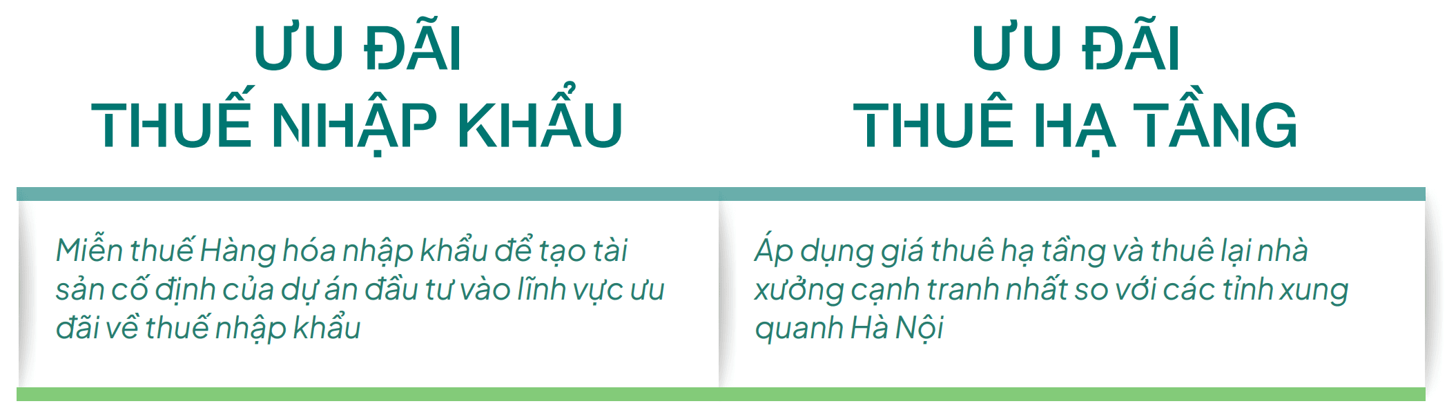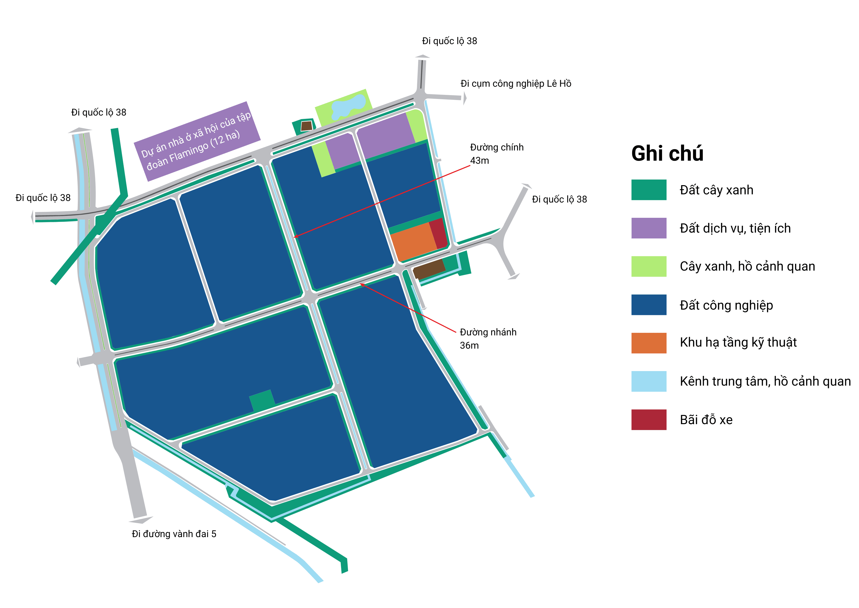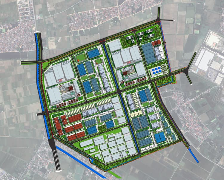 Trong cơ cấu sử dụng đất, dự án sẽ bố trí khoảng 167 ha xây dựng nhà máy, kho bãi; hơn 5 ha đất dịch vụ KCN; 26,6 ha đất cây xanh mặt nước; 2,4 ha đất hạ tầng kỹ thuật và hơn 29 ha đất giao thông. Đất sản xuất công nghiệp, kho bãi sẽ bao gồm 8 lô đất ký hiệu CN.01 – CN.07, được phân chia diện tích linh hoạt cho các loại nhà máy 1 – 3 ha và trên 3 ha. Các lô có mật độ xây dựng tối đa 70%, chiều cao tối đa 5 tầng, hệ số sử dụng đất tối đa 3,5 lần.